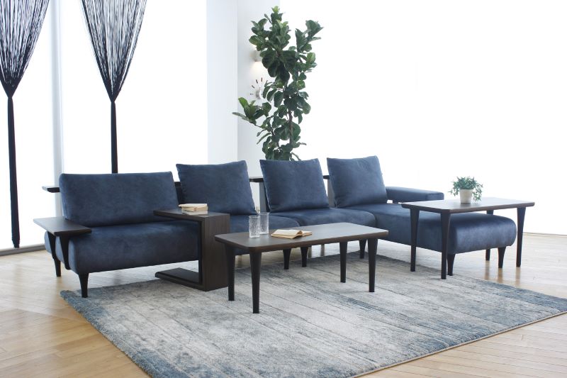 ソファに合わせたセンターテーブル、サイドテーブル、TV ボードも揃えています。
