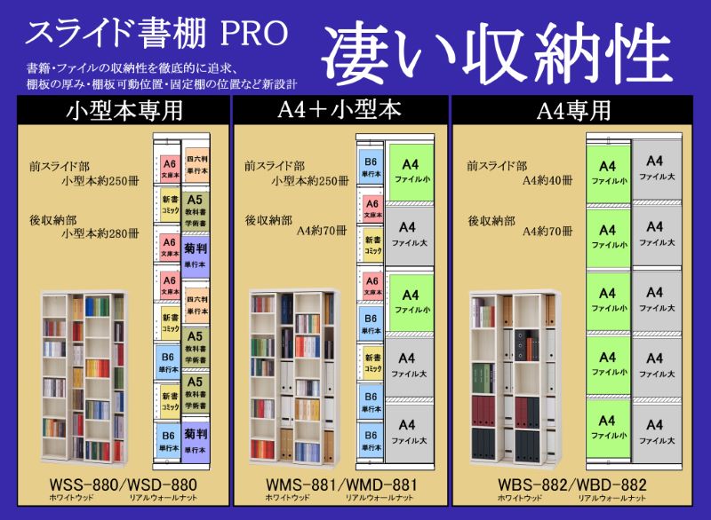 小型本専用・小型本+A4収納・A4専用の3タイプを用意、幅広いニーズに対応できる