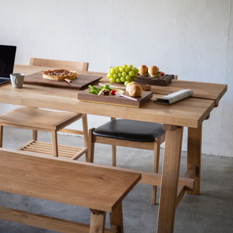 天板の長さが140~220(cm)まで、20cm単位でラインナップしたダイニングテーブル。食事をしたりワークスペースになったり本を読んだり、それぞれの目的で集う場所、自然と会話が弾むテーブル。オークの他に地松が選択でき、使い込むほどに深い飴色に育っていく。