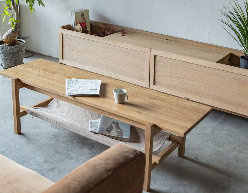 センターテーブルとしては大きめの150cm幅で、ゆったりとお使いいただけます。収納部の生地には、同じ岡山県の「倉敷帆布」を使用し、シャトル織機で織り上げられた帆布独特の風合いをお楽しみいただけます。