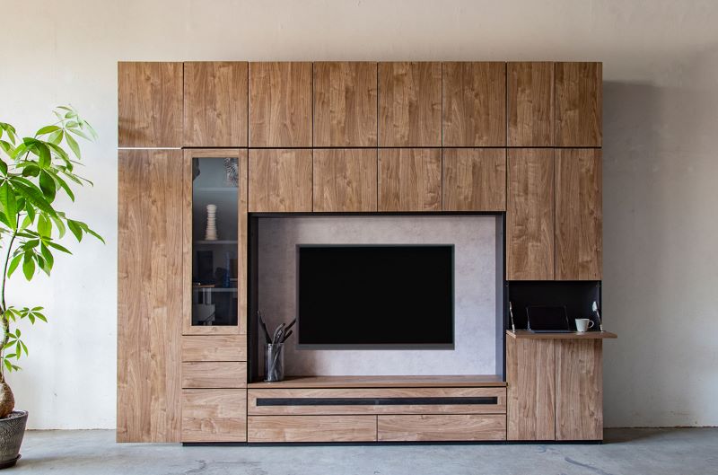 壁面収納 U-storage は、テレビボードだけでなく、いろいろなシーンに活用でき、天井までピッタリの大型収納に限らず、ローボードやミドルボード、カウンターとしての組合せ、ご提案も可能。